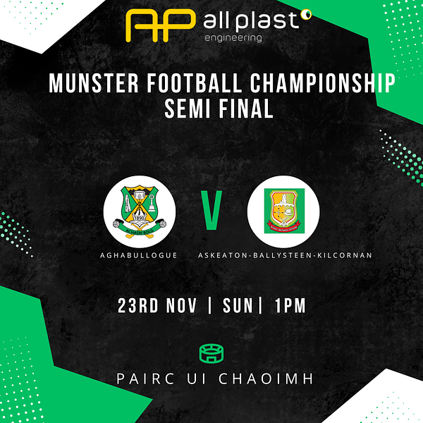 Massive weekend once again for the club. In the main event we take on Askeaton-Ballysteen-Kilcornan in the Munster Semi Final on Sunday at 1pm in Pairc ui Chaoimh. Tickets must be pre purchased