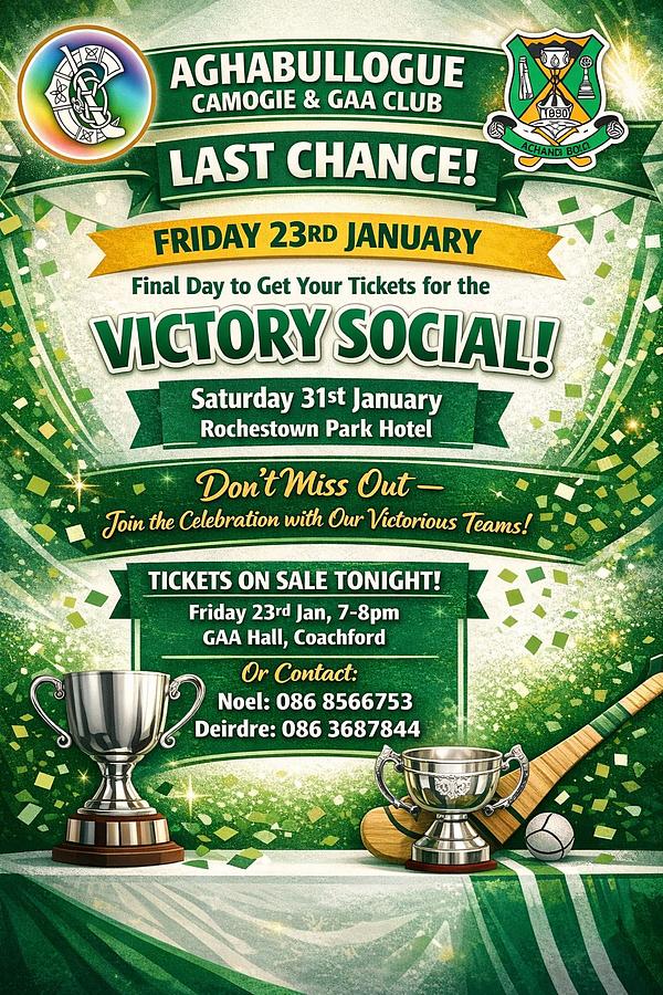 Last chance to get your social tickets tonight between 7pm-8pm in the GAA Hall. Numbers need to be finalised for the venue so make sure to get your tickets.